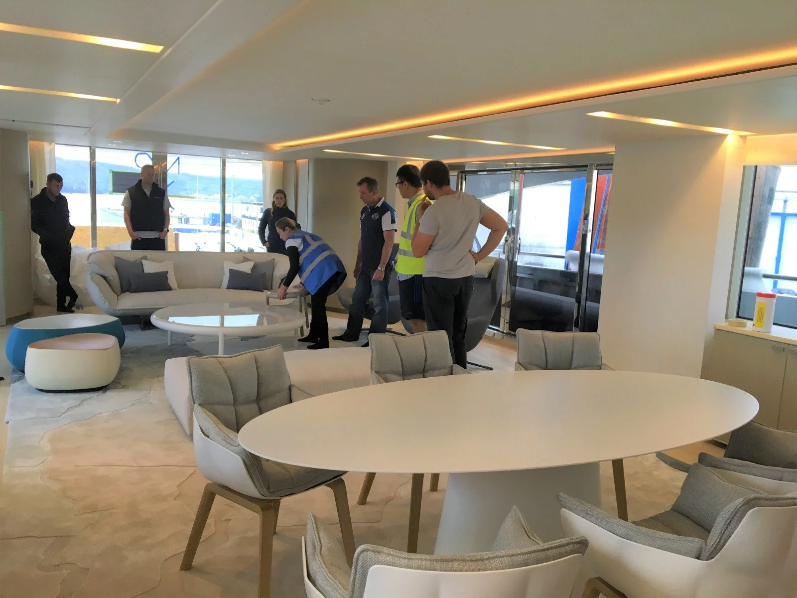 We had to go back to the furniture showrooms and flip over furniture pieces to ensure that they could be secured on the yacht, because their undersides are not shown on online catalogues. Thus, we had to physically go down to the showrooms to check them.