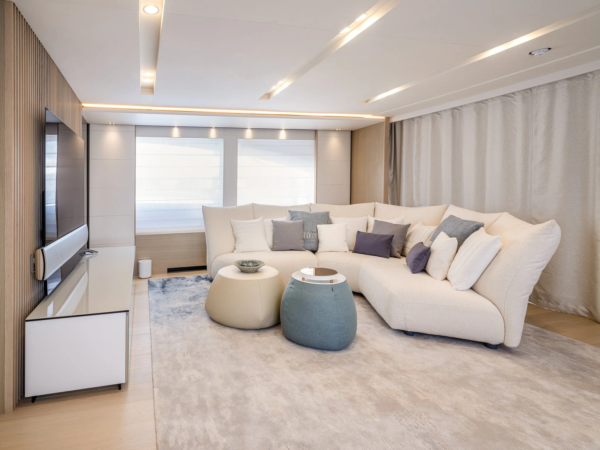 The living room of the 40m long Princess Yacht. Designing for a moving vessel put our team’s skills and experiences to the test.