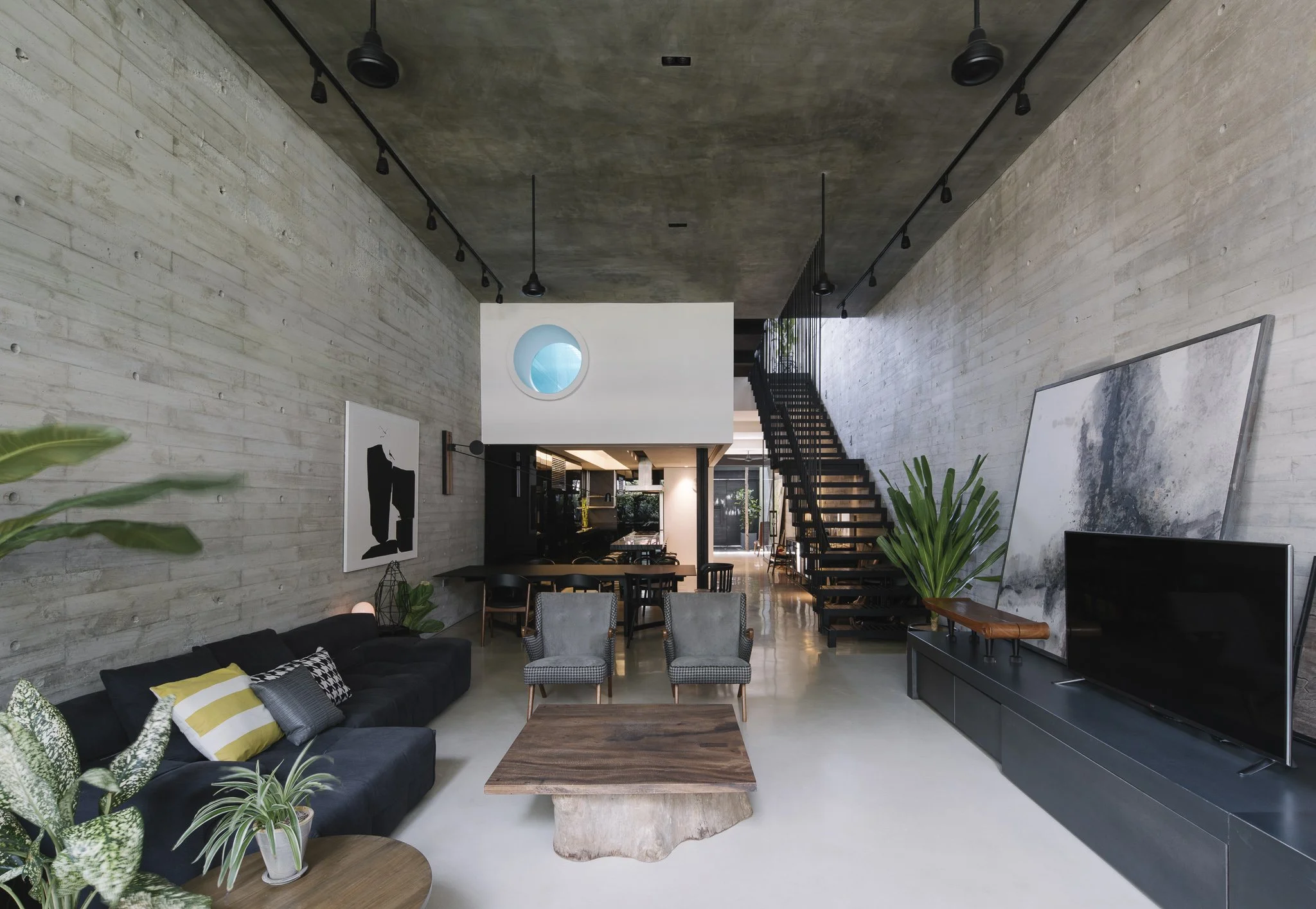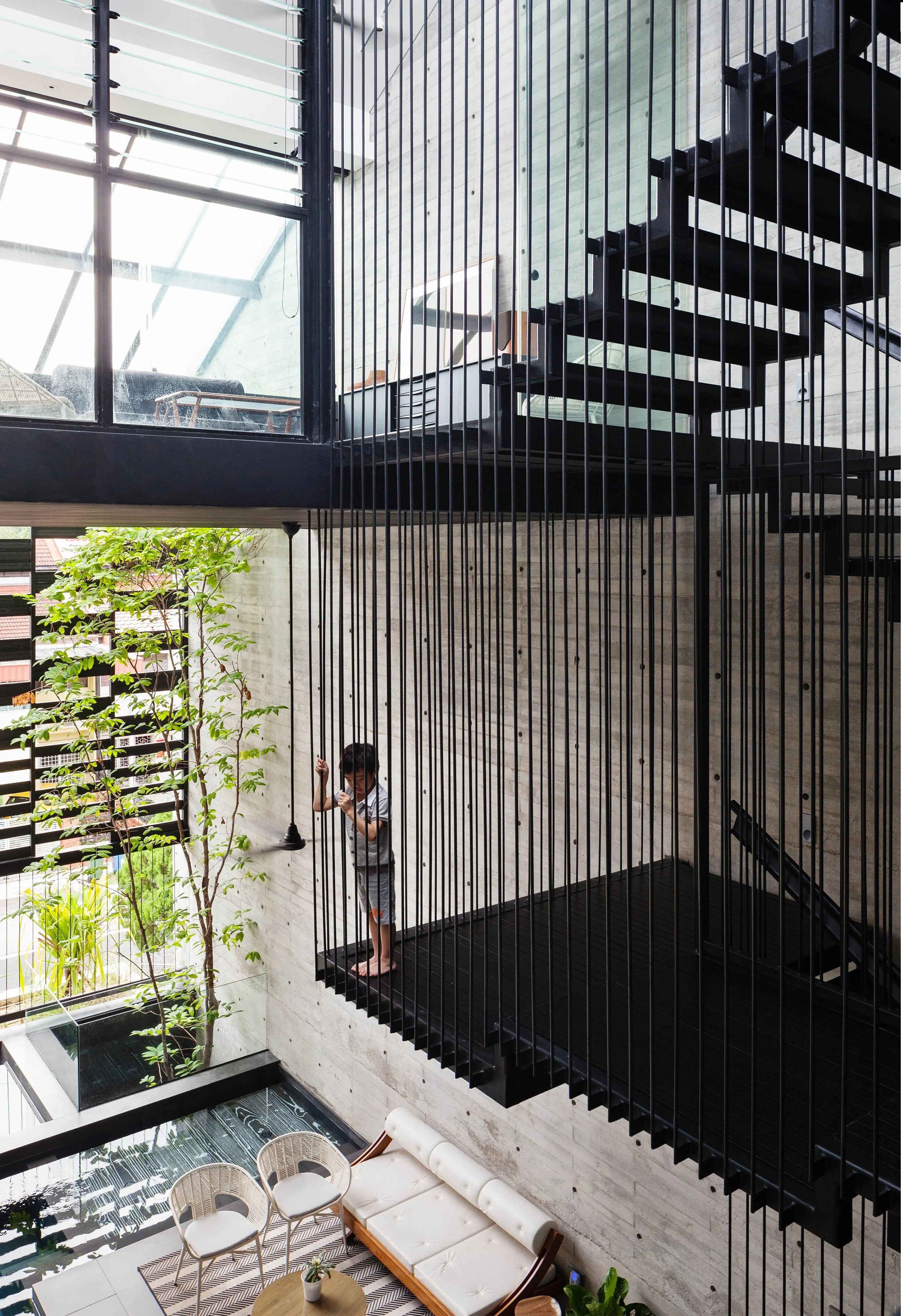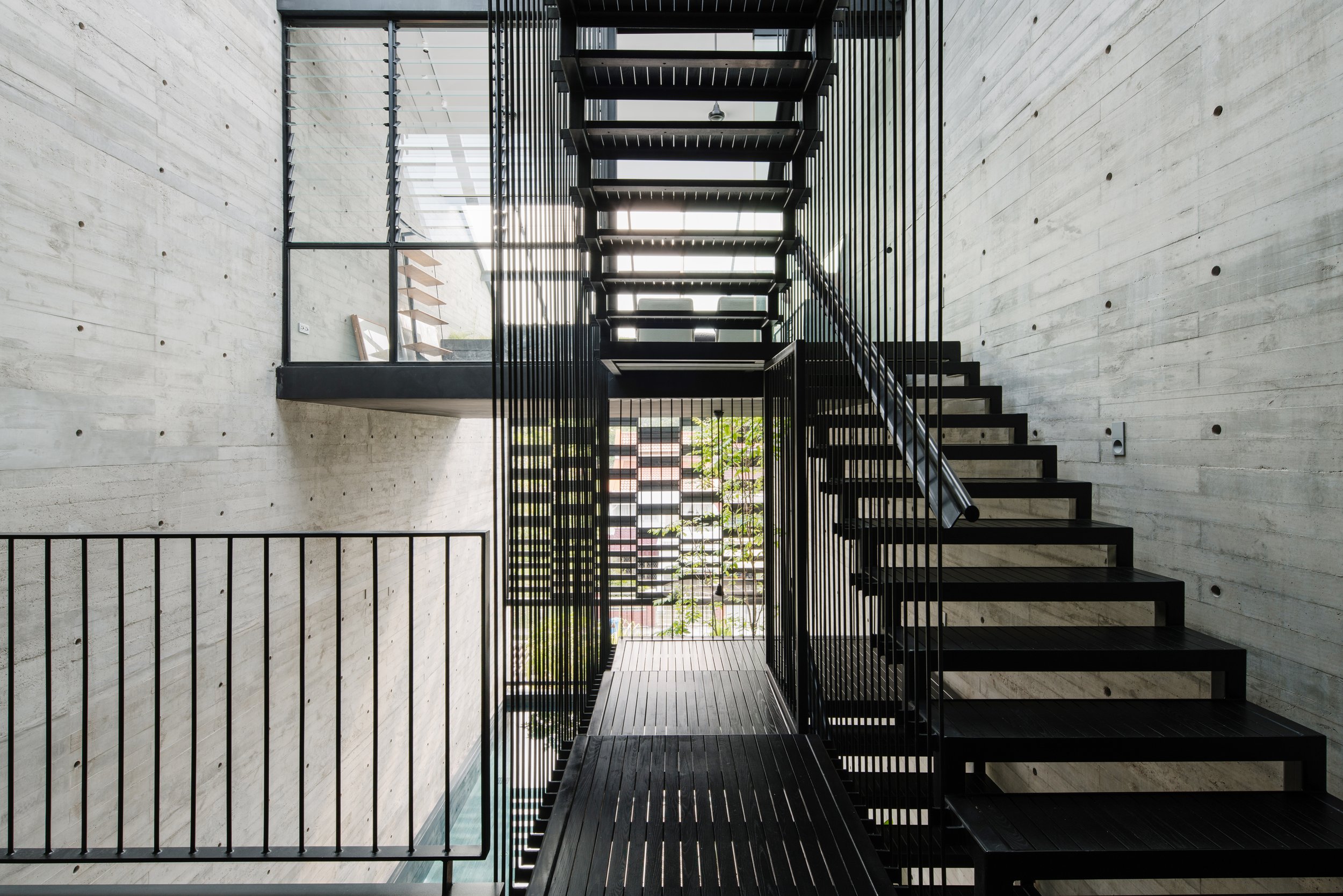 Due to the couple's busy work schedules on weekdays, there is this eagerness to see and hear everyone whenever they are at home on the weekends. The day-lit inner atriums between the two party walls becomes central to creating connections throughout the house. It acts as the amplifier of sounds from within and from outside where one can easily talk across the floors or hear exactly what is going on around.