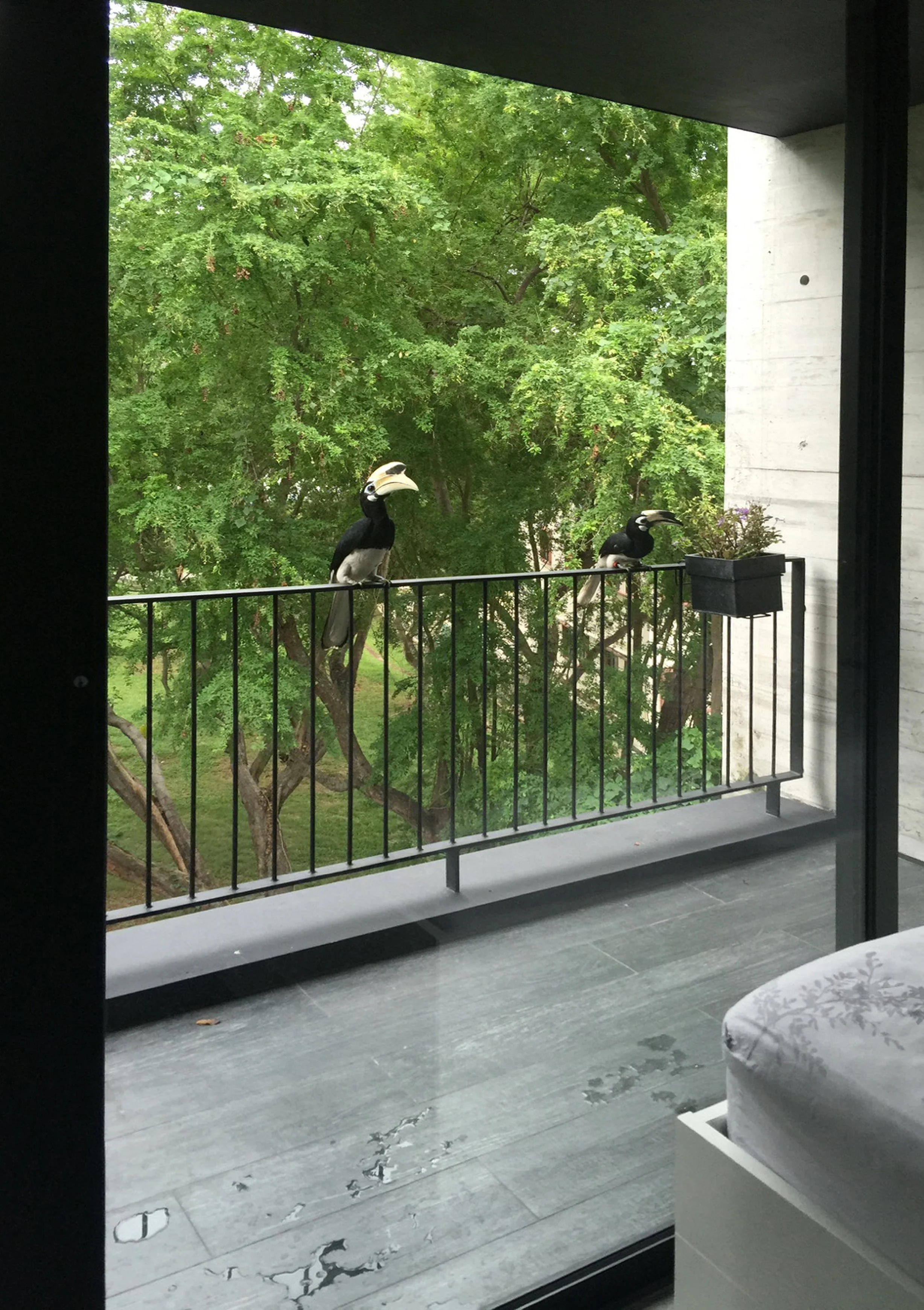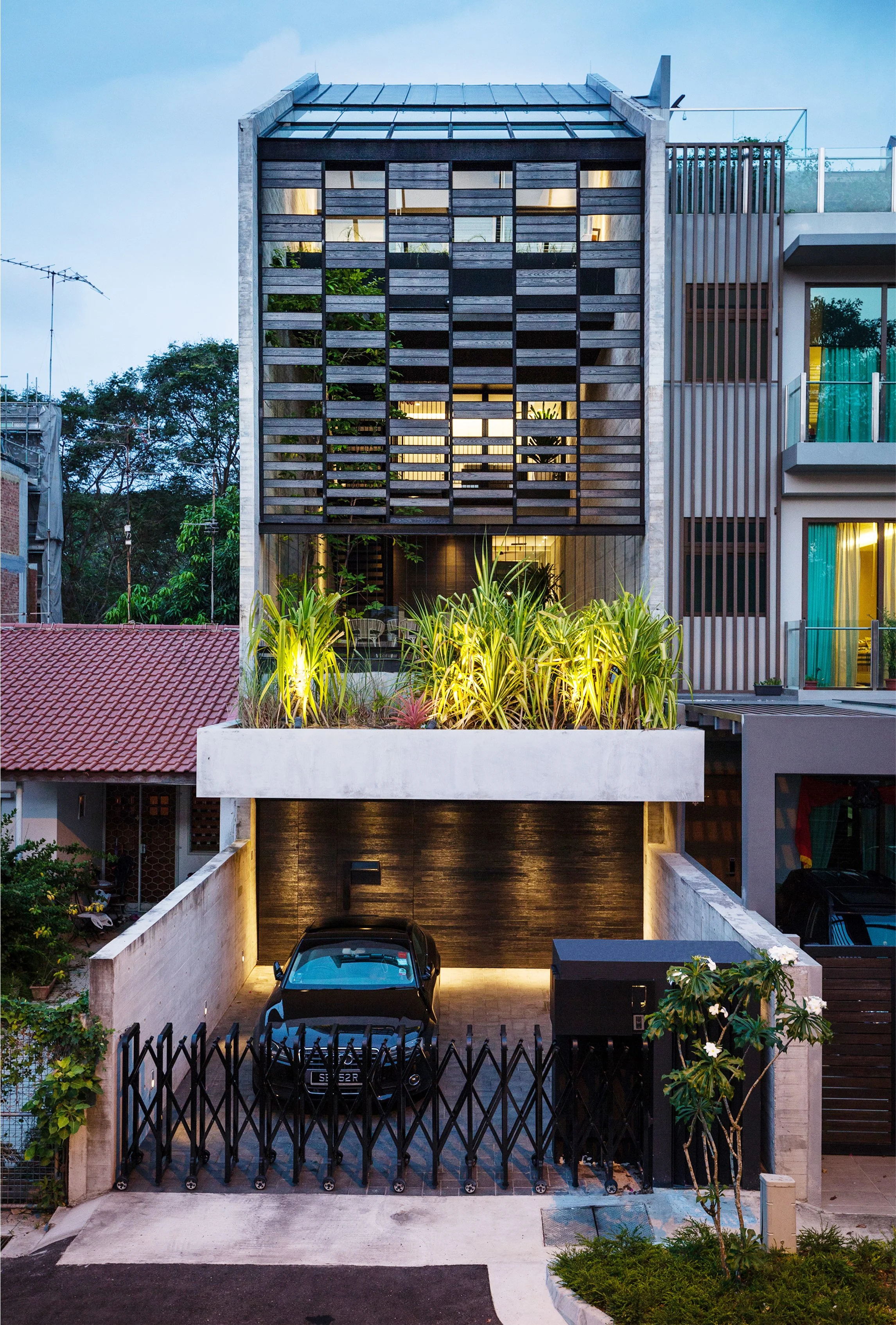 The house is extremely open from the front as it is only shielded by a black ash wood and metal screen of varying porosity above the car porch roof planter. The most porous part of the screen is the lowest part which is just above the pool water level. This enables winds to go right into the house and as it moves over the water body through to the various levels and out to the back or out through the ventilated glass roof over the central atrium, the spaces get cooled down significantly. The staircase stack is designed with open treads to facilitate very effective cross ventilation into the rooms at all levels as that axis allows a straight view out to the back via either the rooms or corridors.