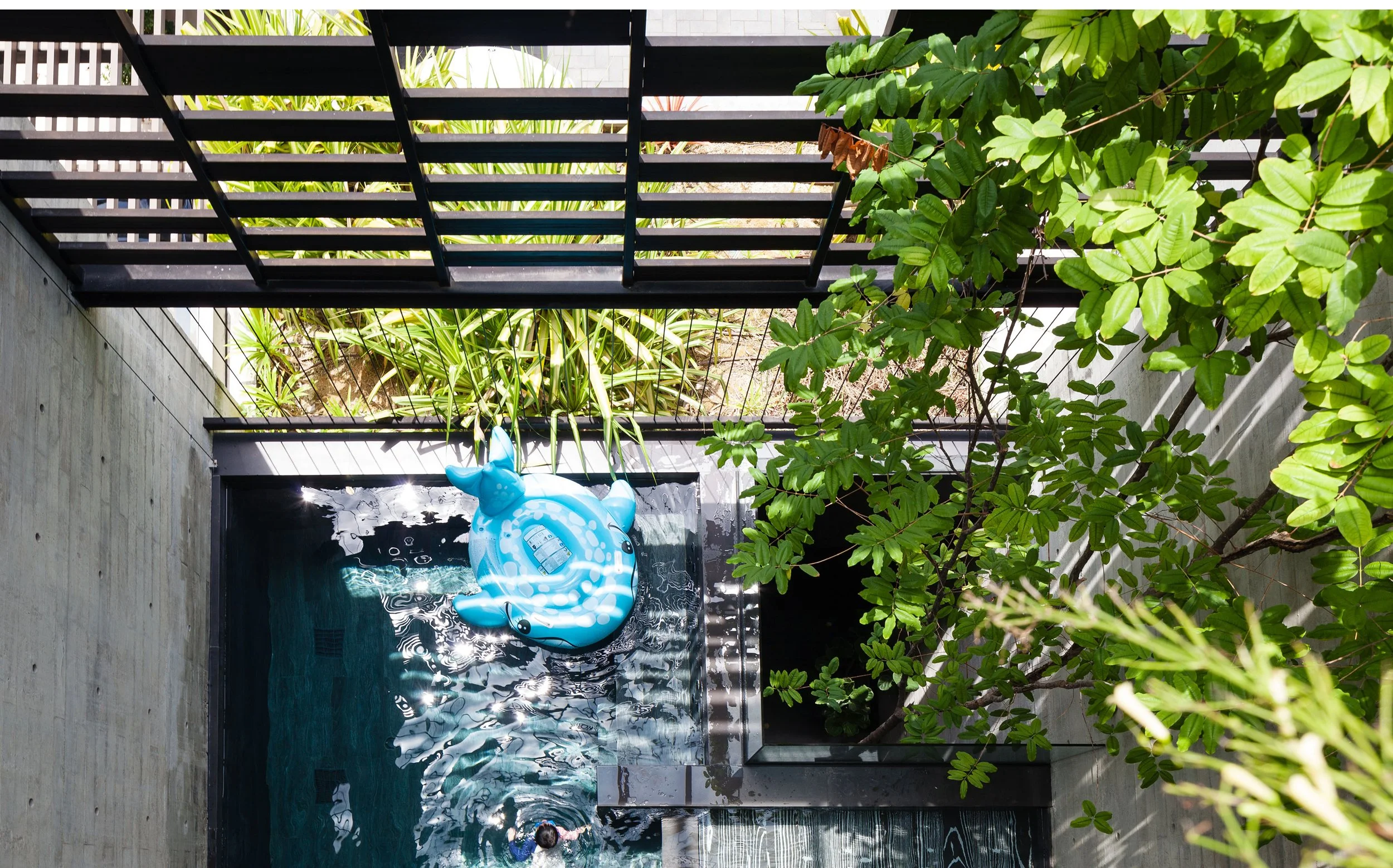 Open House is planned with a long 'base' on the first storey which comprises predominantly the main living space, the dining area and the all-in-one kitchen. The kitchen is the only space on this level that can be enclosed by hidden glass panels when air-conditioning is required. A 13m-long lap pool forms the centrepiece of the indoor atrium on the second storey. There are 'skylights' built into the floor of the pool to allow daylight penetration into the kitchen below. Where the pool 'juts' into the living room, there is a circular glass window in the pool that lets light and view through into the living room while also creating a view out into the 'park' behind from inside the pool.