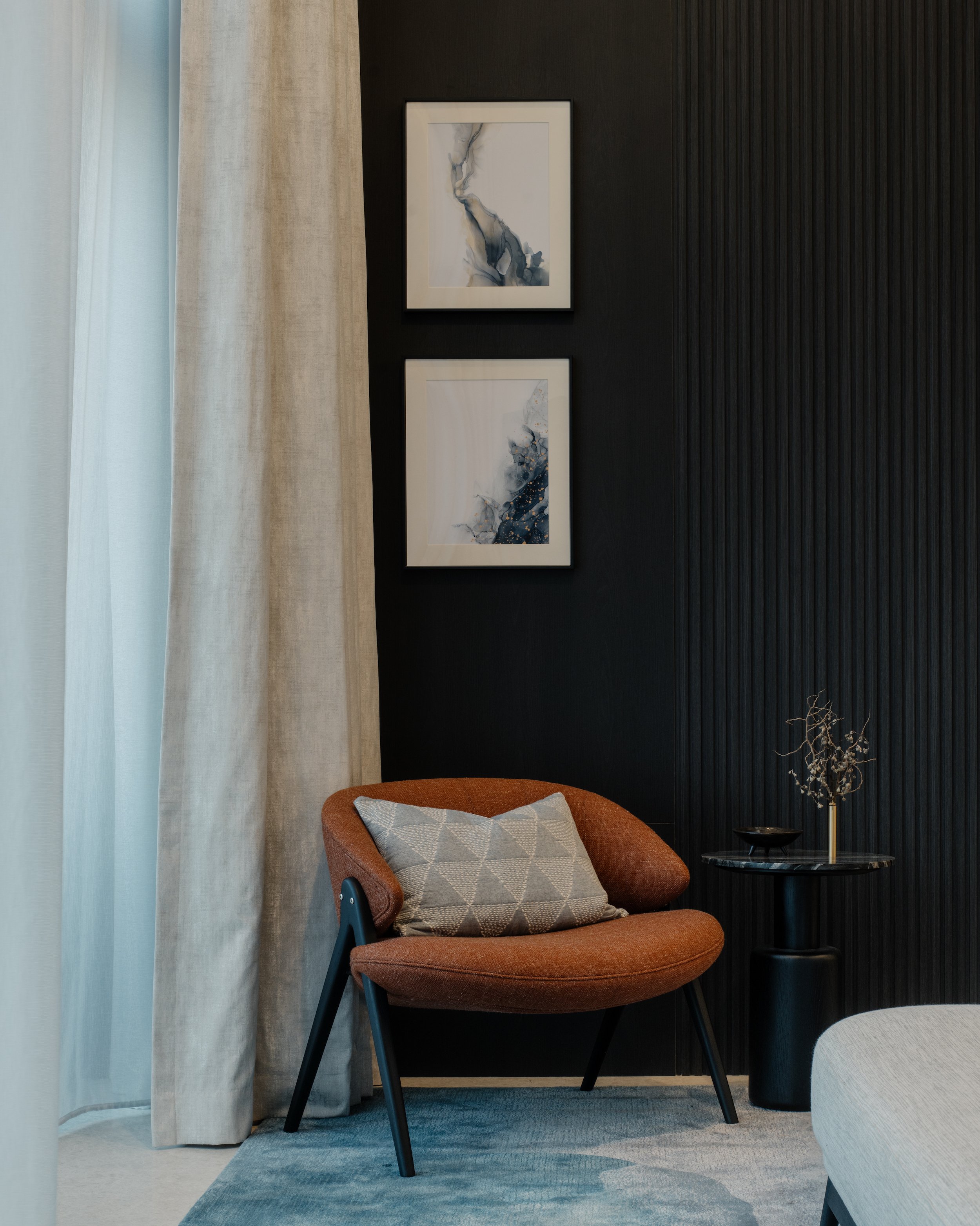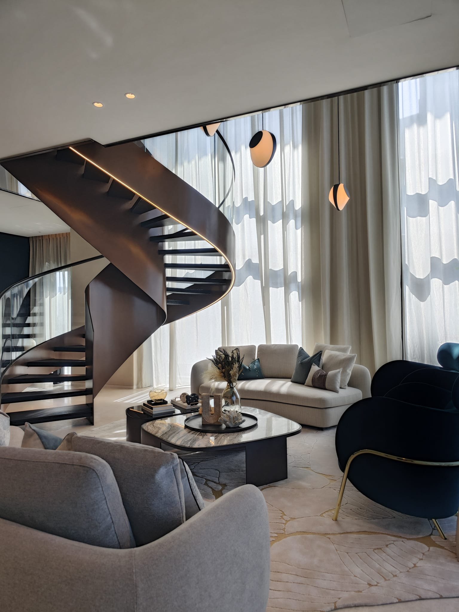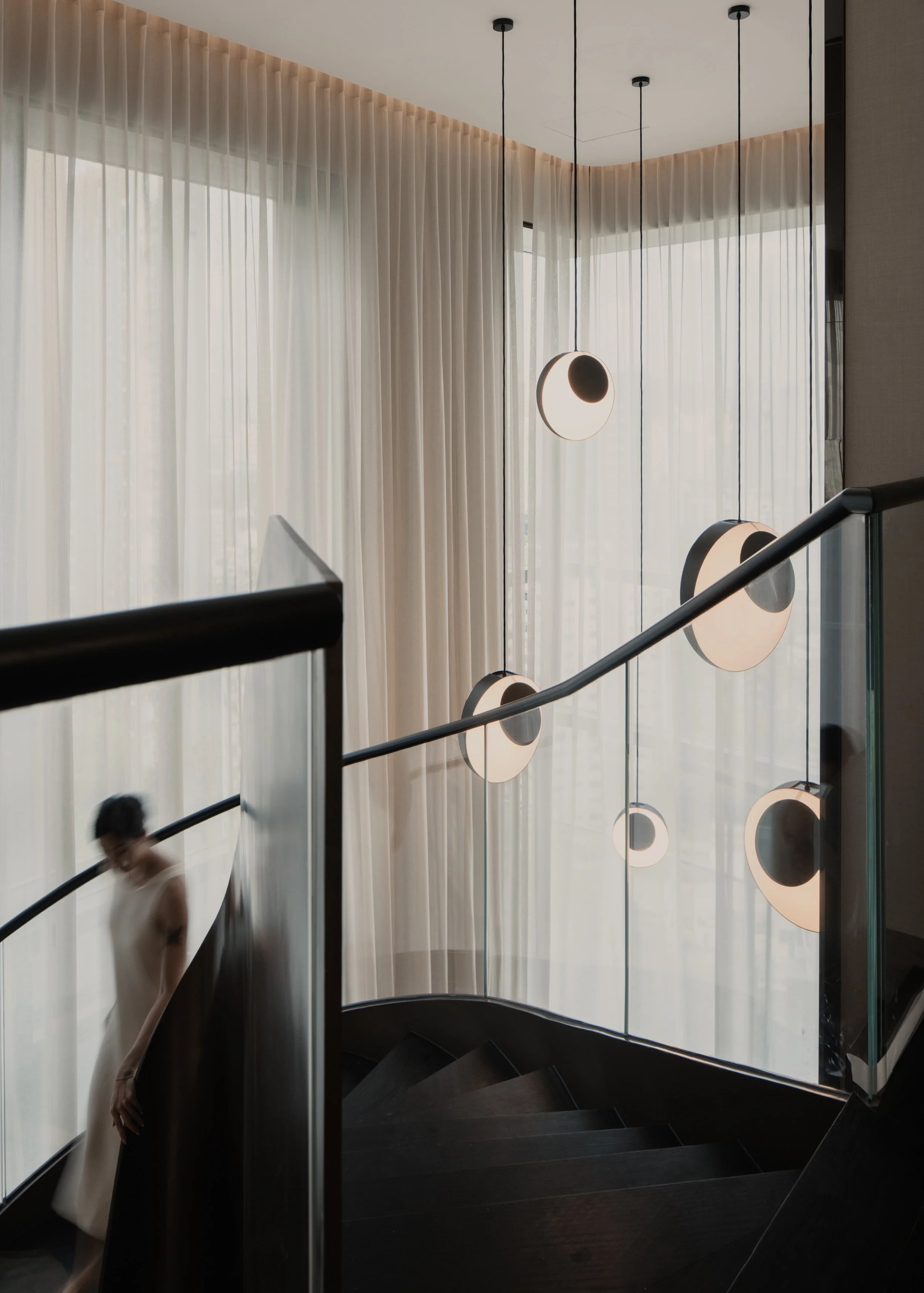 Our design ethos has always been to draw from the elements of nature and Oasis in the Sky is no exception to this. The soft flowing lines of the sculptural staircase is reminiscent of water while the gently curved-edges of the neutral toned sofa seats precisely capture the essence of smooth pebbles. As the lightly sheer curtains billow in the wind, they evoke a sense of being amongst clouds — particularly as the light streams in between its folds. Placed alongside flowing steps and pebble-like furnishings, they form a picturesque landscape, visible to the discerning eye.