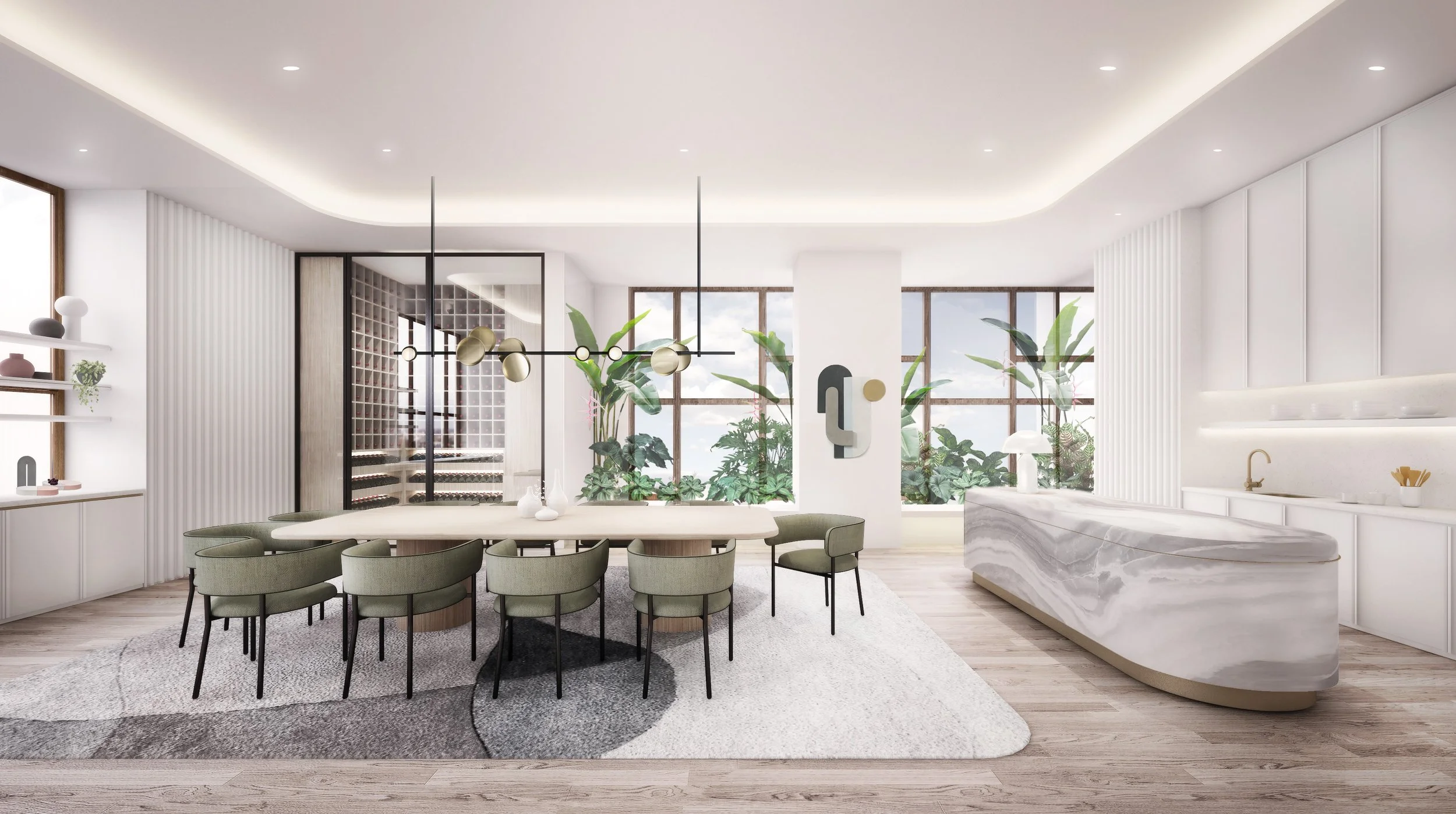 Outdoor living is further celebrated with tropical plants and botanicals introduced into the interior spaces and wall graphics.