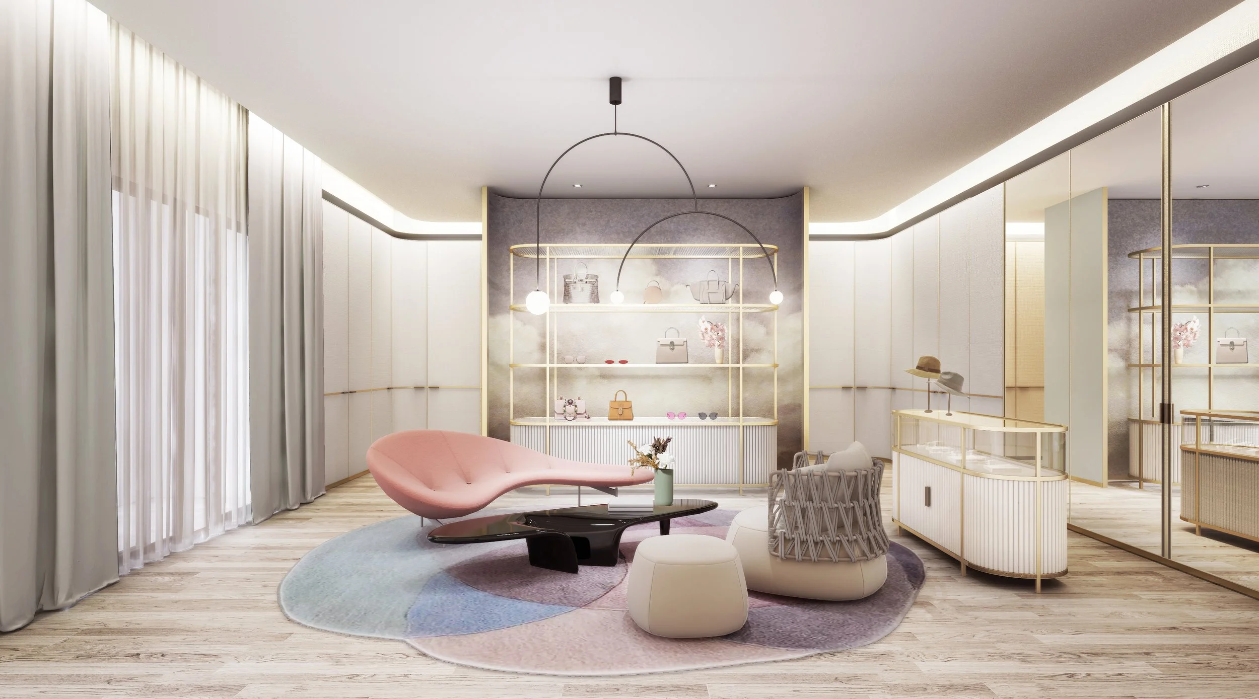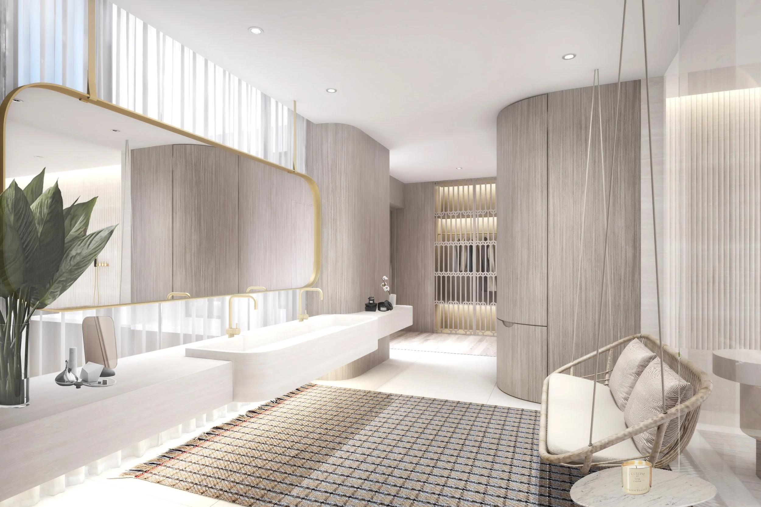 In the walk-in wardrobe for her, Pierre Frey wallpaper featuring patterns of soft clouds, reminiscent of sunset hues, alluding to how close the penthouse unit is to the actual clouds outside. The dreamy ambience combined with the overall feminine and pastel palette of the room, it makes for a beautiful setting for wardrobe parties with an intimate gathering or taking styled photographs.
