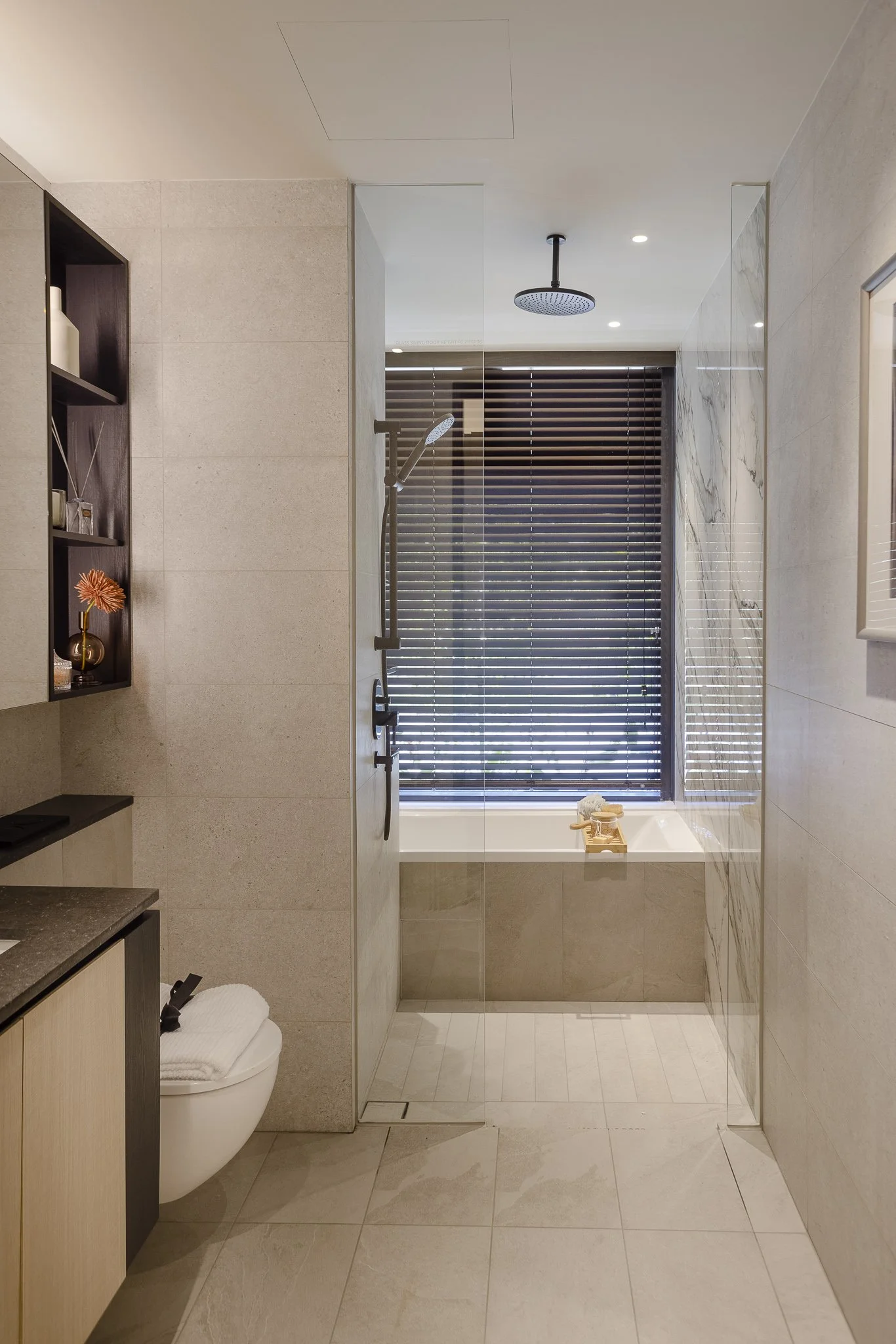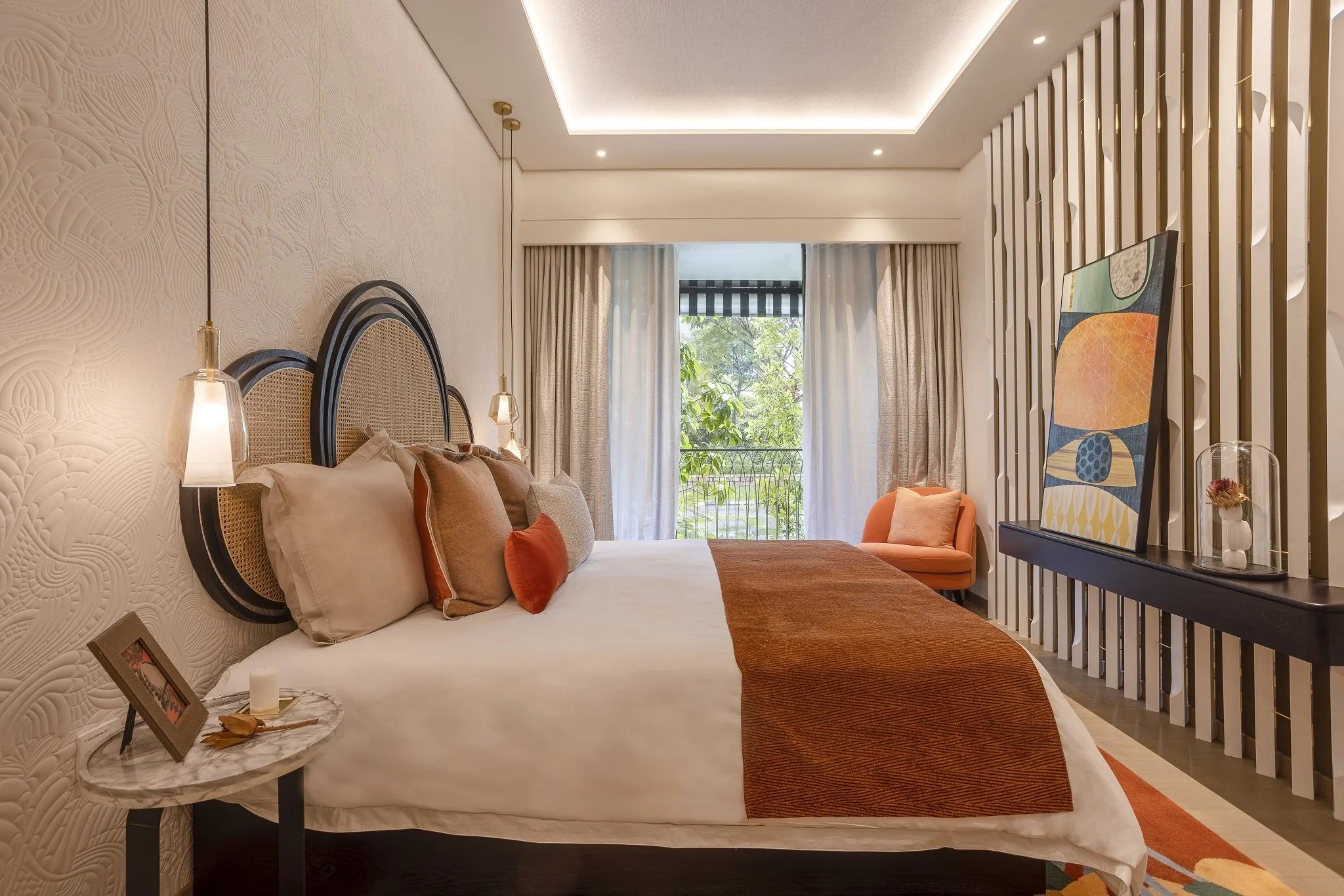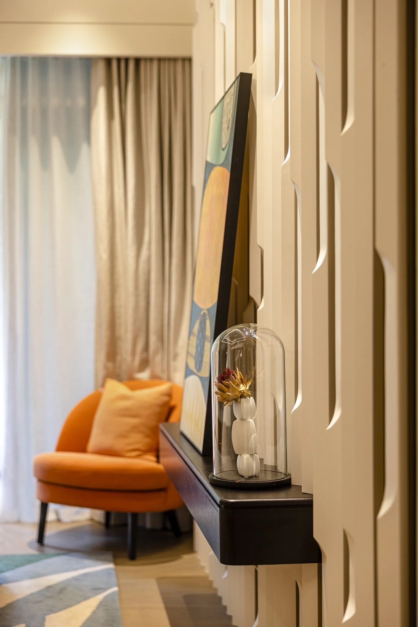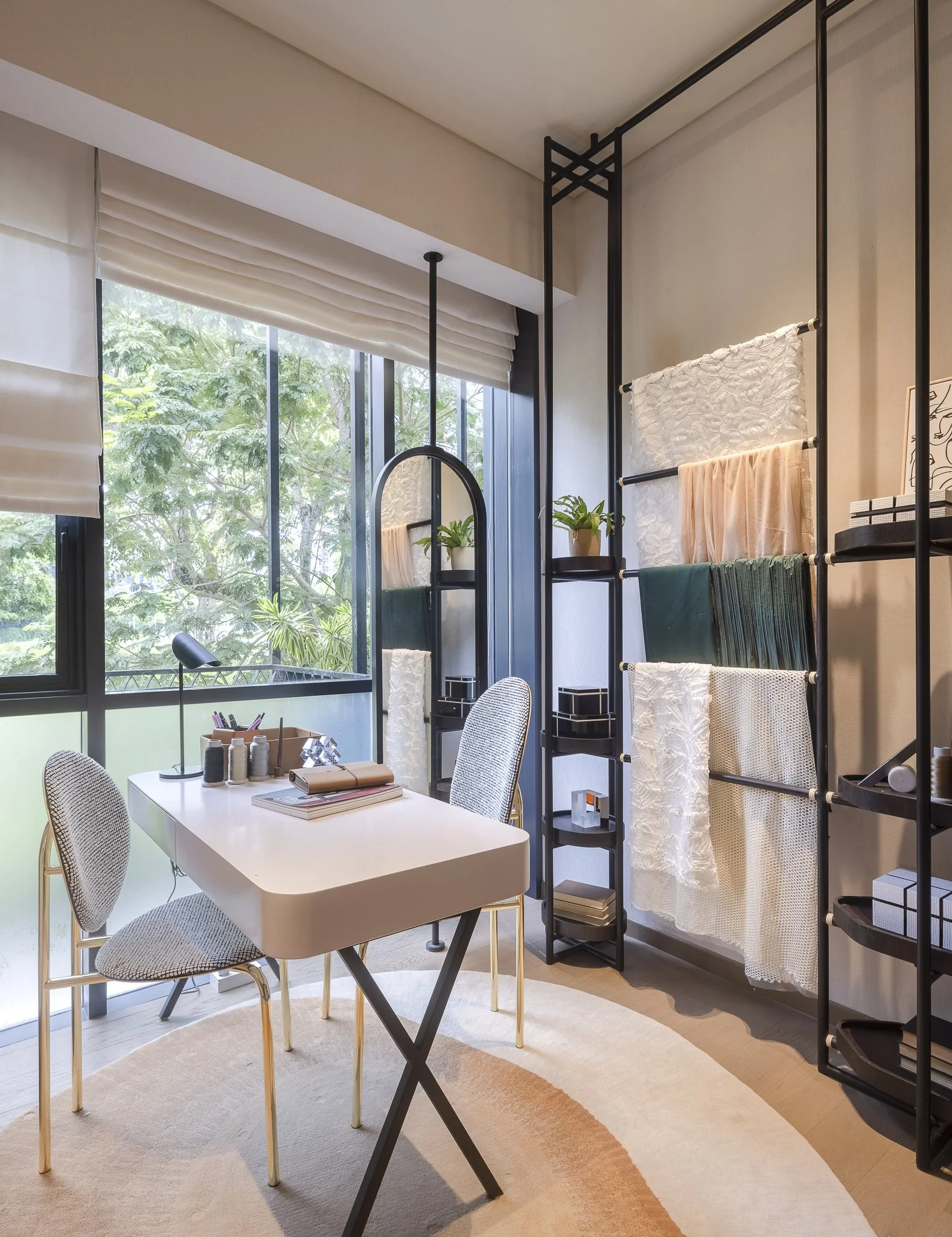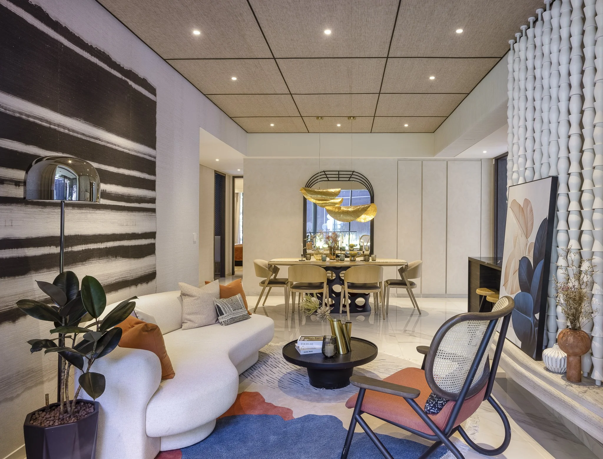 A showflat designed with multigenerational living in mind, the interiors feature layers of nature inspired materials, like linen, wicker, weaved wall coverings, open pore timber to bring out tactility in a subtle way. The color palette is kept neutral with a splash of vibrancy in the carpets and upholstery.