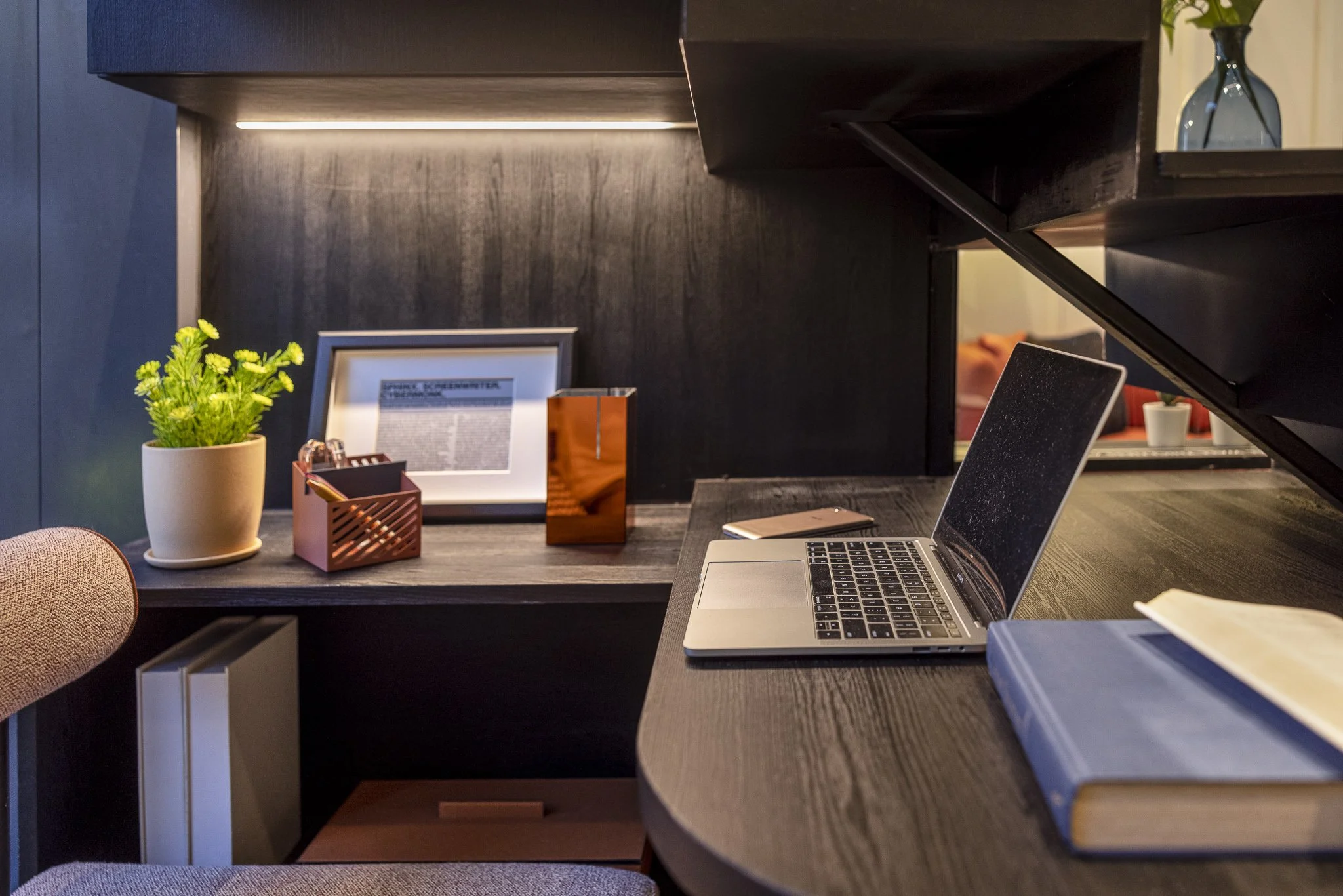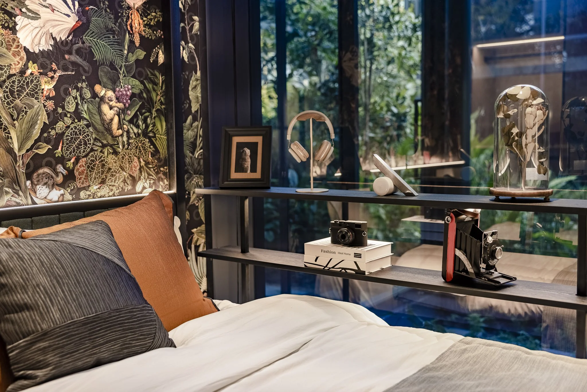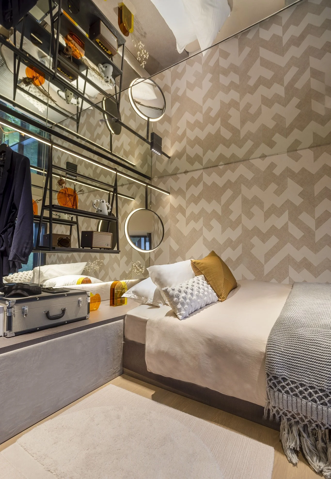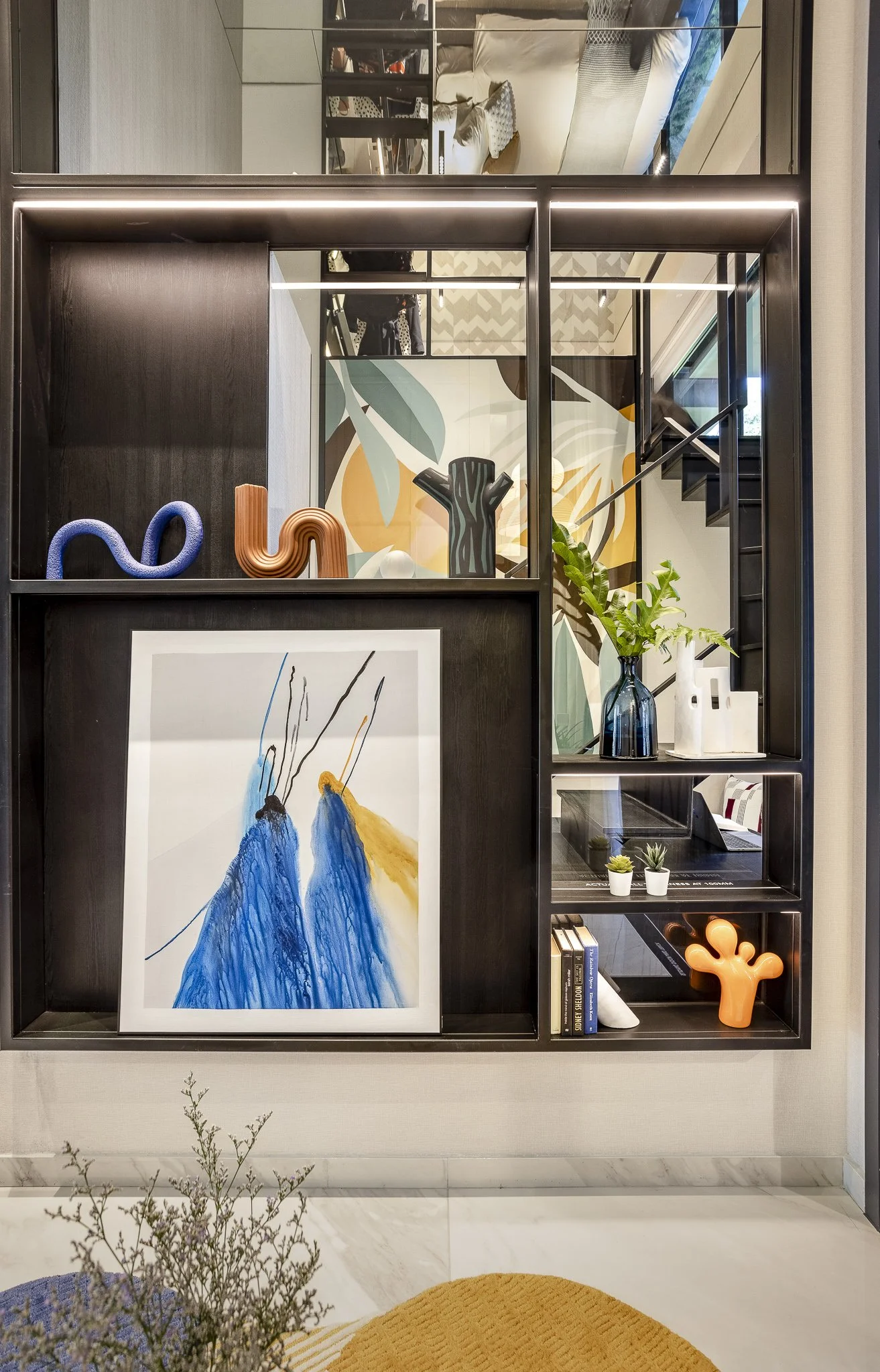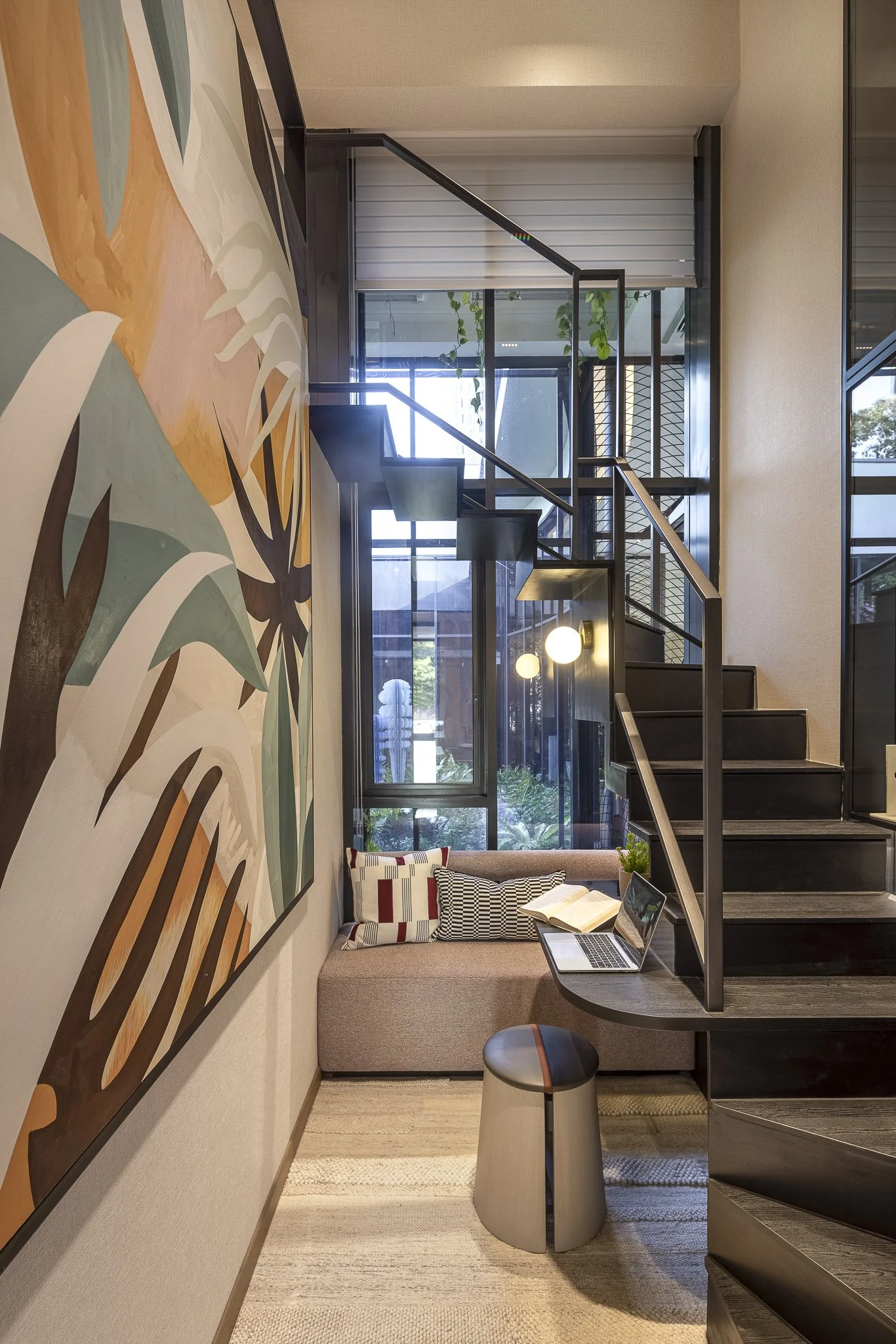 The interior uses an array of bold colors and prints, injecting the space with energy and aesthetic. At the same time, black is an undertone for the whole house to keep it balanced but visually striking. Also utilizing the high ceiling level for this unit, a loft was created for the guestroom, adding more usable space and maximizing the potential for a relatively smaller room.